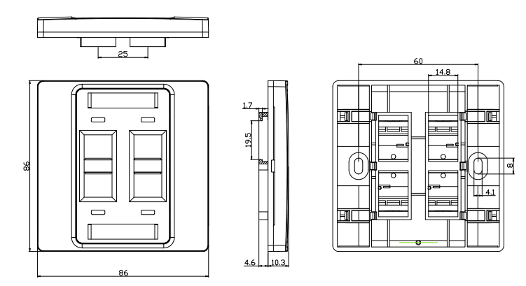 Is iondúil go mbíonn ceithre ghearradh nó oscailtí ag plate 4 chalafort a mheaitseálann toisí agus cumraíocht na gcalafort sonracha atá á n -úsáid. Is féidir leis na cineálacha sonracha calafoirt a bheith éagsúil ag brath ar an iarratas atá beartaithe. I measc na samplaí coitianta tá calafoirt Ethernet (RJ45) le haghaidh naisc líonra, calafox (F-Type) le haghaidh calafoirt chábla nó satailíte, nó calafoirt teileafóin (RJ11) do naisc líne talún.